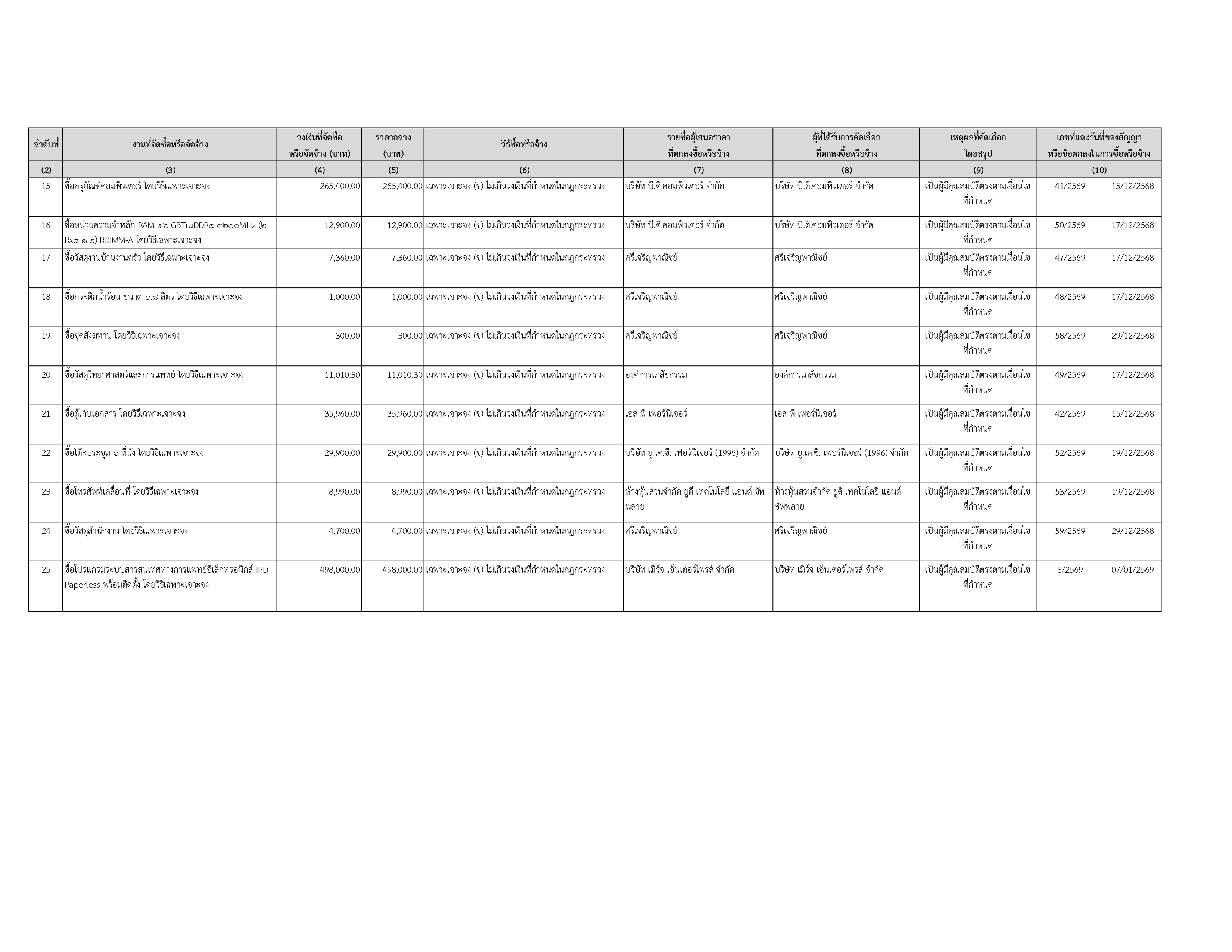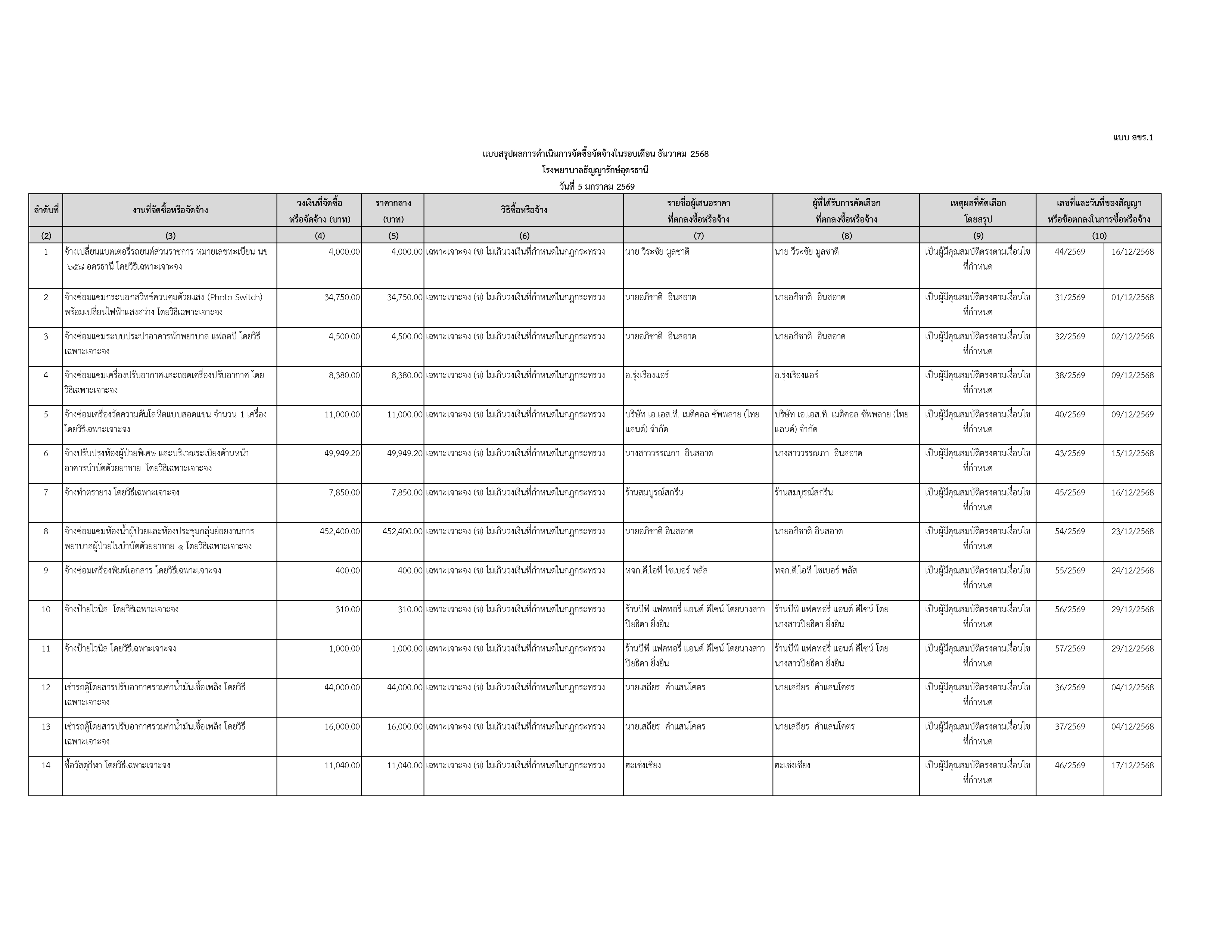 แบบสรุปผลการดำเนินการจัดซื้อจัดจ้างในรอบเดือน ธันวาคม 2568
