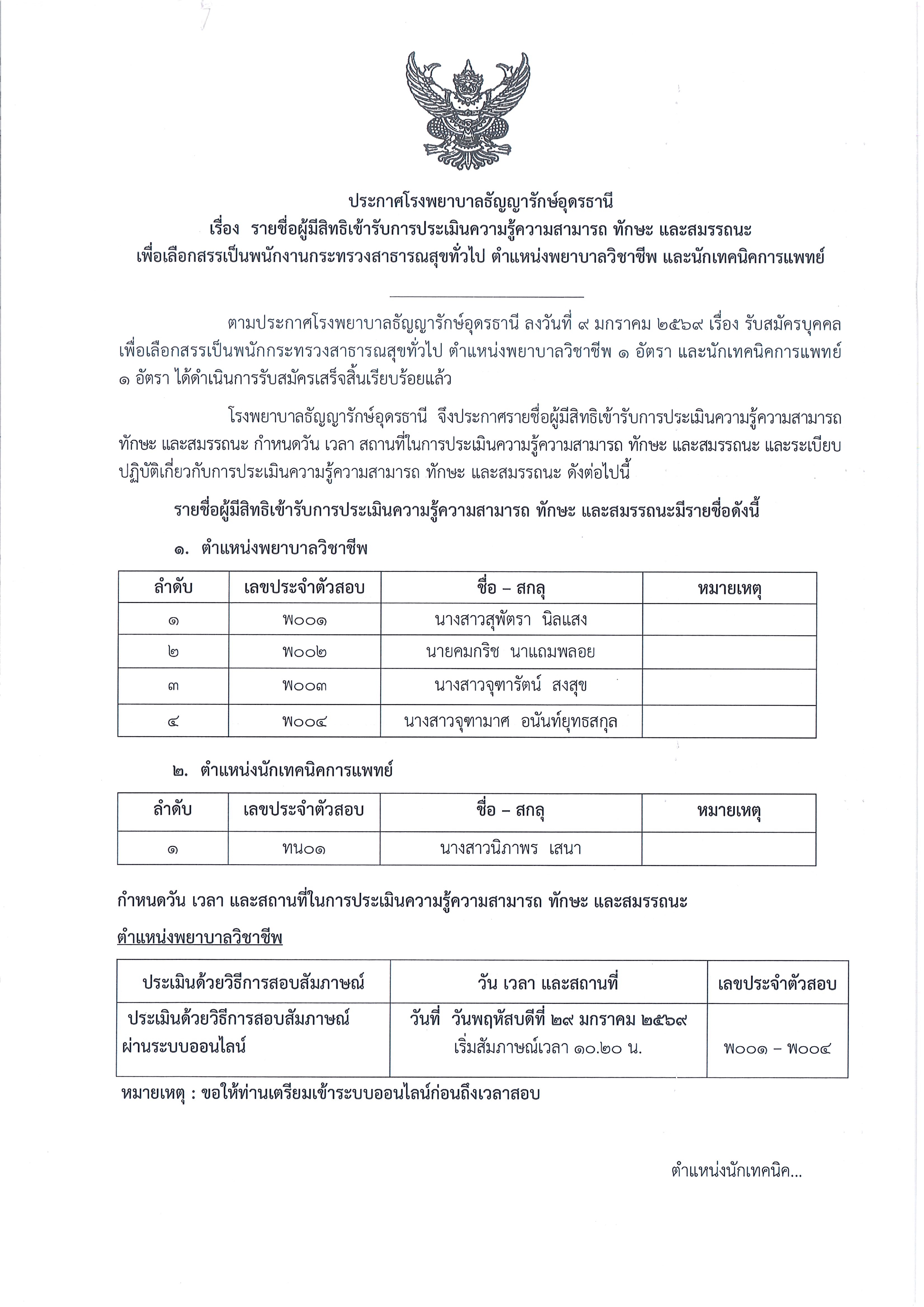 ***ประกาศรายชื่อผู้มีสิทธิเข้ารับการประเมินความรู้ ความสามารถ ทักษะ และสมรรถนะ เพื่อเลือกสรรเป็นพนักงานกระทรวงสาธารณสุขทั่วไป ตำแหน่งพยาบาลวิชาชีพ และนักเทคนิคการแพทย์ // 27 มกราคม 2569
