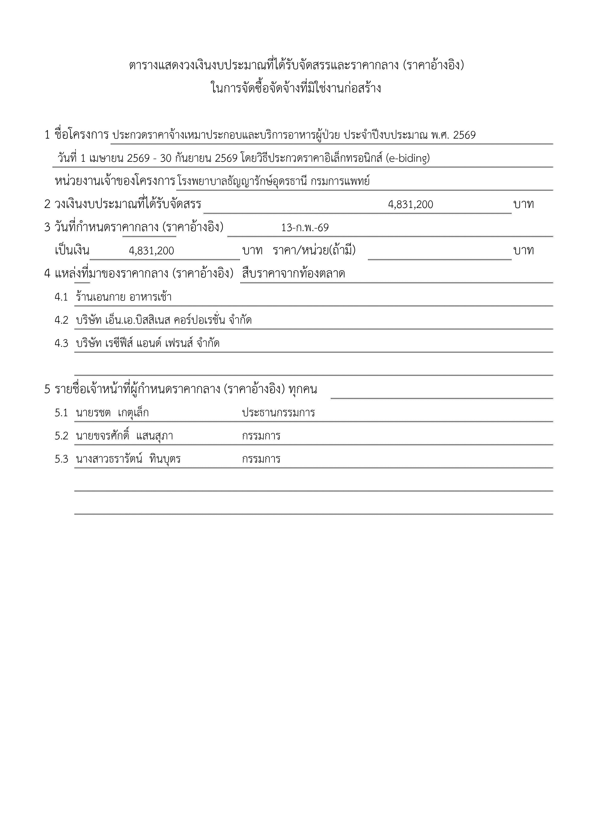 ตารางแสดงวงเงินงบประมาณที่ได้รับจัดสรรและราคากลาง (ราคาอ้างอิง) ในการจัดซื้อจัดจ้างที่มิใช่งานก่อสร้าง โครงการประกวดราคาจ้างเหมาบริการทาความสะอาดอาคารสถานที่โรงพยาบาลธัญญารักษ์อุดรธานี ประจำปีงบประมาณ พ.ศ. 2569 19กุมภาพันธ์ 2569