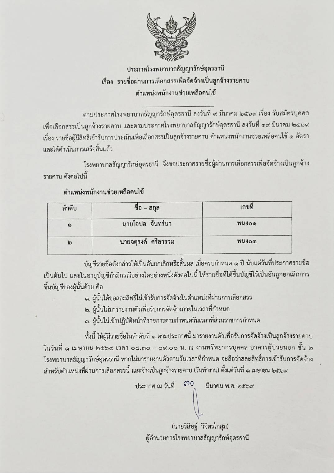 ประกาศรายชื่อผู้ผ่านการเลือกสรรเพื่อจัดจ้างเป็นลูกจ้างรายคาบ ตำแหน่งพนักงานช่วยเหลือคนไข้ //30 มีนาคม 2569
