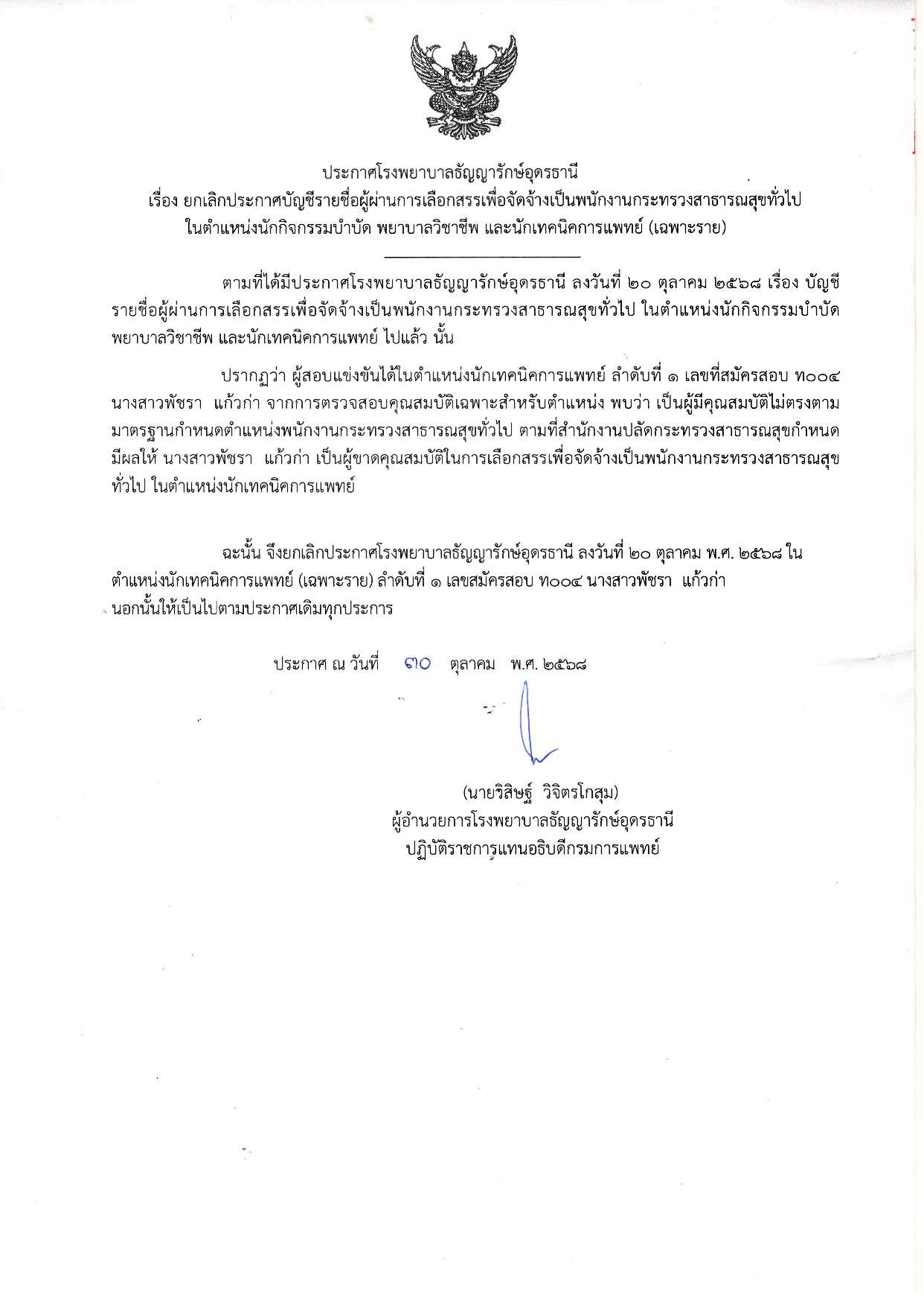 ประกาศ ยกเลิกประกาศบัญชีรายชื่อผู้ผ่านการเลือกสรรฯ (เฉพาะราย) //30 ตุลาคม 2568