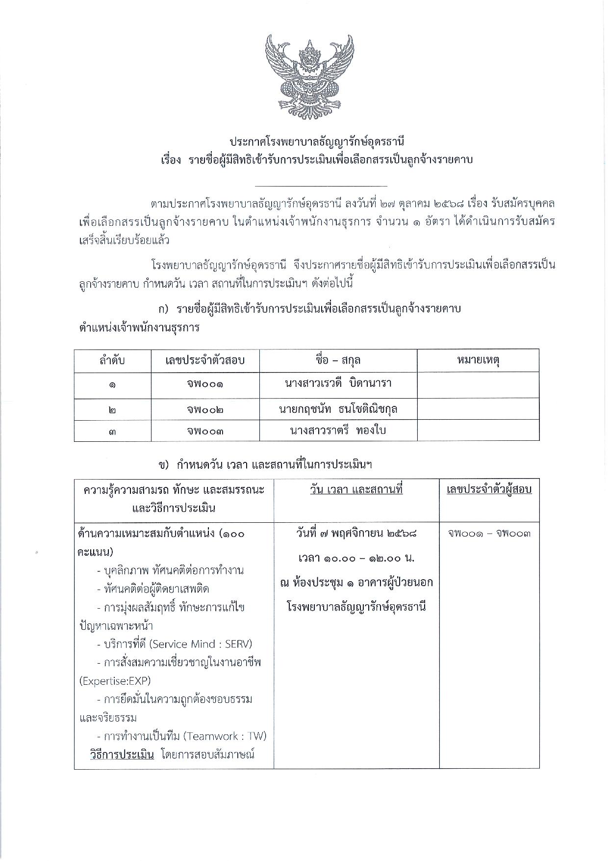 ประกาศรายชื่อผู้มีสิ่ทธิเข้ารับการประเมิน ลูกจ้างรายคาบ ตำแหน่ง เจ้าพนักงานธุรการ //04 พฤศจิกายน 2568